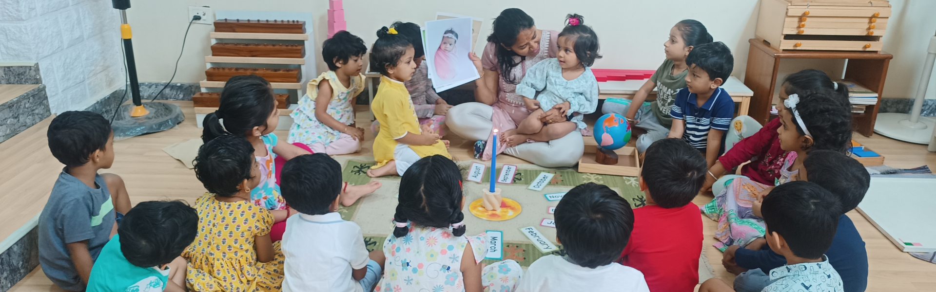 The environment is proportional to children's height and size. Low display shelves allow all material to be within a child’s reach. Child size furniture and material reduce their dependence on the adult. The classroom is divided into work areas where children can work by themselves or in groups. Freedom of movement, freedom of choice and conversations are part of the classroom.
